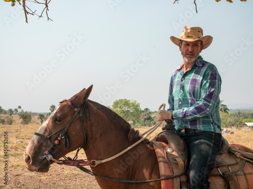 Cowboy is riding his horse on a cattle farm with very dry land