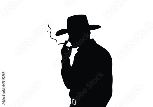 Cowboy smoking silhouette. This image shows a black silhouette of a cowboy smoking, surrounded by sharp, jagged rays resembling the sun. Vector clipart illustration design.