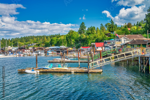 Cowichan Bay boats and wooden homes on a beautiful summer day, Vancouver Island - Canada.