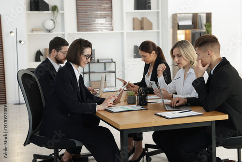 Coworkers with different devices working together at wooden table in office