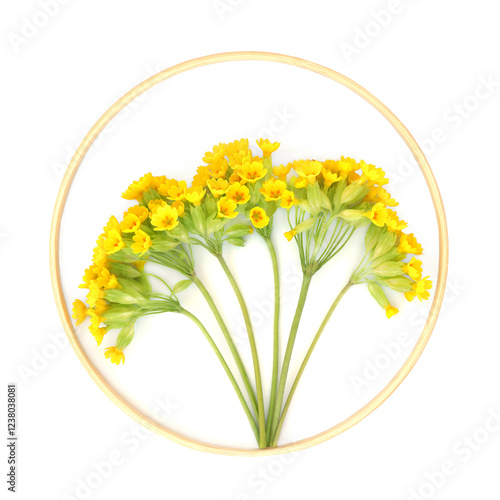 Cowslip flowers on white with wooden frame for logo or greeting card. Used in herbal medicine to treat digestion, respiratory, skincare and stress problems. Primulaceae.