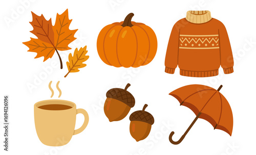 Cozy autumn essentials with leaves, pumpkin, and warm objects in flat design
