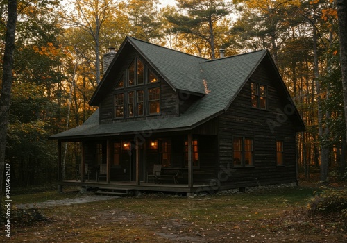 Cozy Cabin in the Woods: A rustic cabin nestled amid the warm embrace of a wooded forest, inviting solitude and the charm of nature with its inviting porch and glowing interior lights.