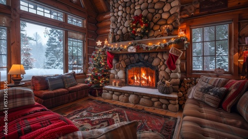 Cozy cabin interior with stone fireplace and festive decor, snow outside