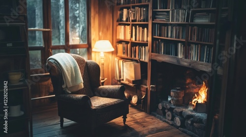 Cozy Cabin Reading Nook Fireplace And Bookshelves
