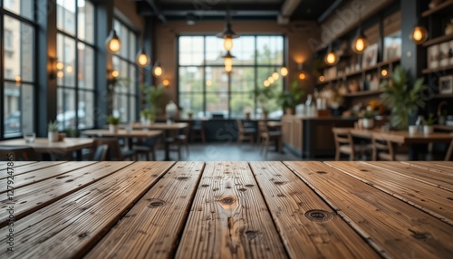 Cozy Cafe Interior with Rustic Wooden Table and Warm Lighting