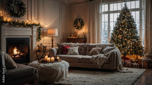 Cozy christmas atmosphere in a living room with fireplace, decorated tree, candles and festive decorations