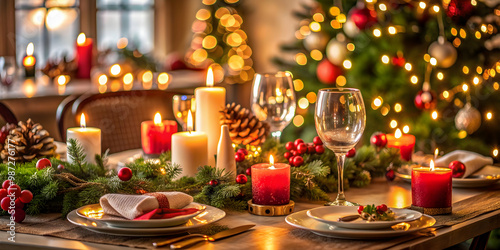 Cozy Christmas dinner with candle lights and elegant decorations, Glittering, celebration, cozy, Christmas, dinner