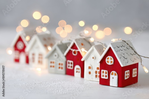 Cozy Christmas garland featuring small red houses with warm lights, creating a festive atmosphere perfect for holiday decorations and seasonal celebrations