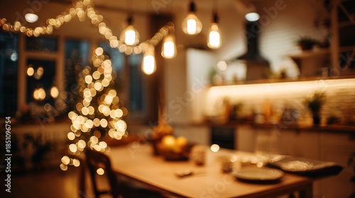 Cozy Christmas kitchen with bokeh lights and decorated tree.