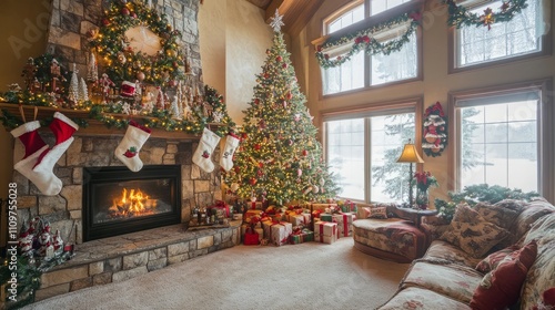 Cozy Christmas living room with decorated tree, gifts, fireplace, and snow outside, perfect for stock images