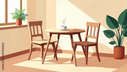 Cozy corner with a table and chairs, featuring a steaming cup in a sunlit room