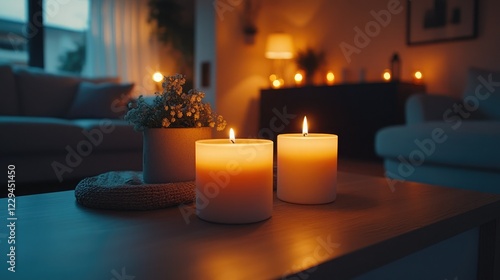 Cozy evening ambiance with glowing candles and soft lighting in a serene living room