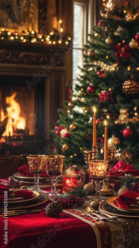 Cozy holiday scene with fireplace christmas tree and festive table