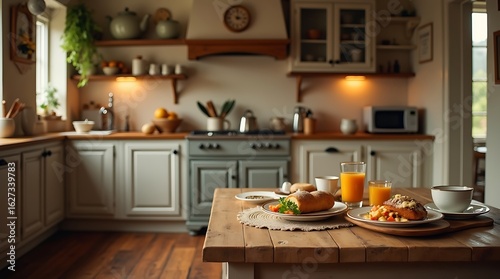 Cozy kitchen breakfast scene with fresh pastries, juice, and coffee creating a warm inviting morning atmosphere