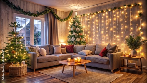 Cozy living room ambiance with festive string lights adorning the wall, soft couch and decorated Christmas tree creating a warm and inviting holiday atmosphere.