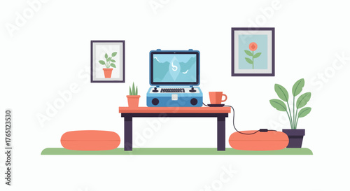 Cozy Living Room Setup with Laptop and Plants.