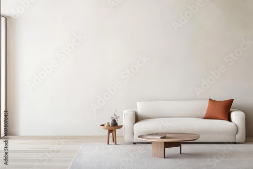 Cozy living room with a modern sofa wooden coffee table and minimal decor in soft tones