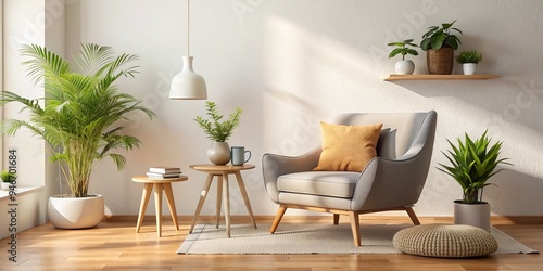 Cozy Living Room with Armchair, Plants, and Wooden Floor, 3D Render, Interior Design, Minimalist, Home Decor