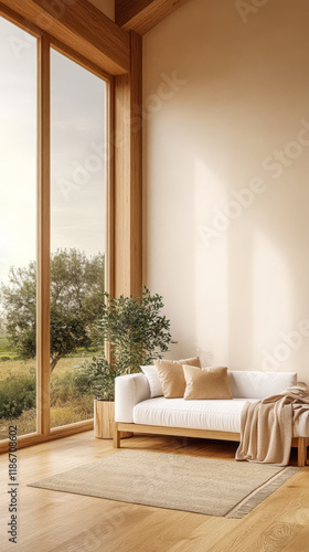 Cozy living room with large windows showcasing nature in a serene setting