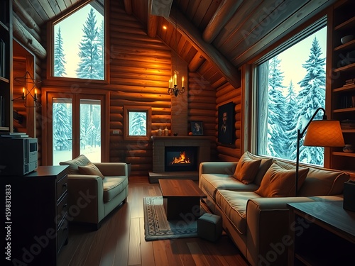 Cozy luxurious wooden cabin interior with warm sunlight and rustic details, surrounded by snowy forest, ultra-realistic texture and atmospheric lighting.