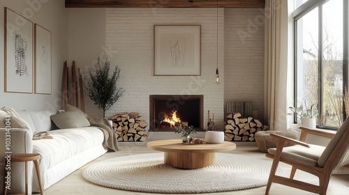 Cozy minimalist living room, white brick fireplace, neutral color palette, large windows, natural light, wooden accents, potted plant, round coffee table, textured rug, modern furniture, Scandinavian