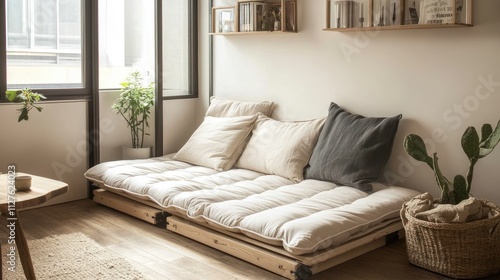 Cozy Minimalist Living Room with Stylish Floor Cushions and Plants