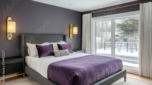 Cozy modern bedroom, graphite walls, violet satin bedding, upholstered panels, brass wall sconces, snowy street view