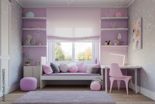 Cozy modern children bedroom for girl, lilac light colors. Super photo realistic background, generative ai illustration