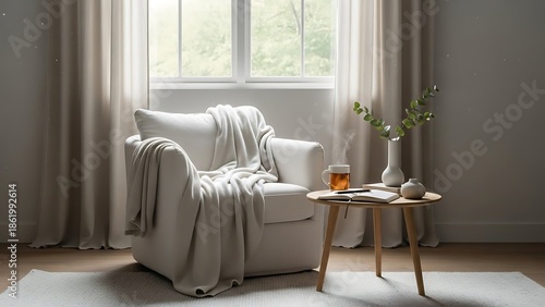 Cozy Modern Living Room, Relaxed Atmosphere, Home Interior, Photo, Bright Natural Light, Inviting View, Tranquility Concept