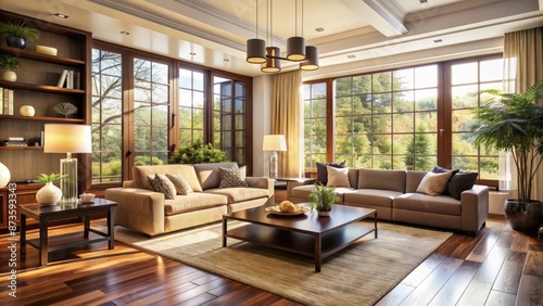 Cozy modern living room with cream walls, dark wood furniture, and large windows with natural daylight pouring in.