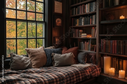 Cozy reading nook with a book and pillows overlooking a beautiful autumn scenery by the window in a library