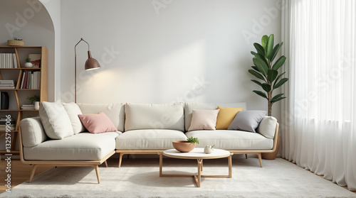 Cozy Scandinavian Living Room with Modern Minimalist Decor, Neutral Tones, Wooden Furniture, and Indoor Plants