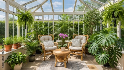 Cozy sunroom with lush greenery and comfortable seating area indoors