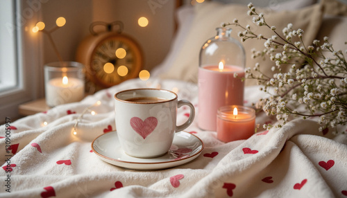 Cozy tea setting with heart-pattern throw, warm evening ambiance