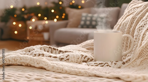 Cozy Winter Mug on Knit Blanket Christmas Lights Background