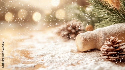 Cozy Winter Scene with Rolling Pin and Snowy Pinecones Decorations