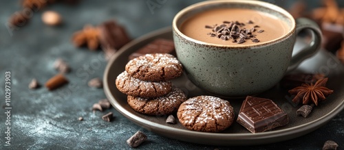 Cozy winter still life with hot cocoa in a rustic cup served with chocolate cookies and sweet treats on a textured table