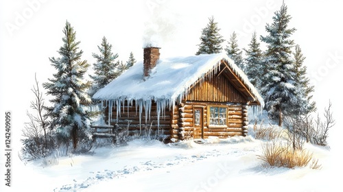 Cozy wooden cabin surrounded by snow-covered trees in a serene winter wonderland scene with icicles hanging from the roof