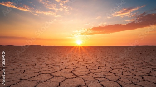 Cracked earth desert sunset landscape, arid climate, environmental background, global warming illustration