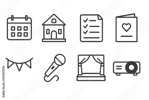Craft Event Icons. Line style icons of craft event planning: calendar, venue, RSVP list, invitation, decoration, microphone, stage