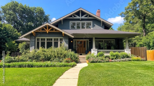 Craftsman-style house, sunny day, lush garden, suburban neighborhood; real estate listing