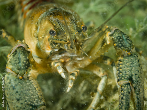 Crayfish, underwater photo. Invasive species in Hancza Lake. Macro shot, selective focus.