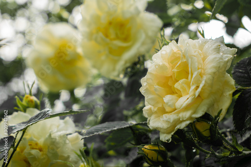 Cream roses on a bush with water drops.