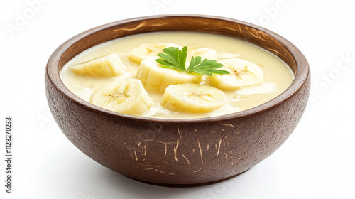 Creamy Banana Dessert in Wooden Bowl Sweet, Creamy, Delicious. Generative Ai.