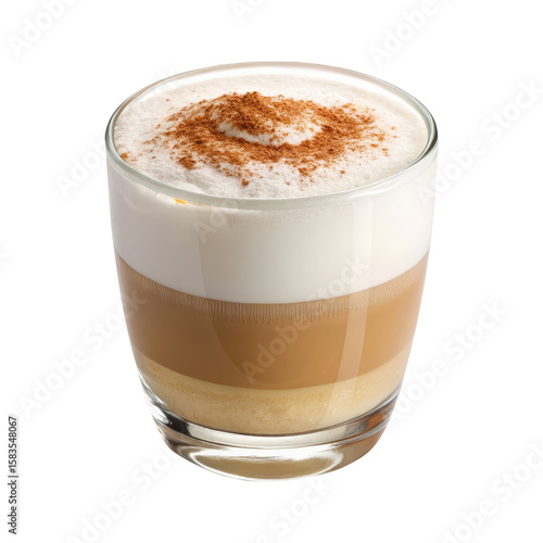 Creamy cappuccino with layered espresso and milk foam topped with cinnamon in a clear glass cup isolated on clean transparent background in PNG for café menus, gourmet beverages, and coffee visuals