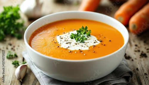 Creamy Carrot Soup Topped With A Dollop Of Tangy Sour Cream, Perfect For A Warm And Comforting Meal For Any Occasion.