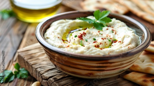 Creamy cashew saffron dip a ceramic dish smooth and aromatic served with lavash crackers