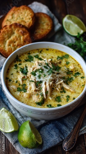 Creamy chicken soup with herbs and lime garnish for comforting meal
