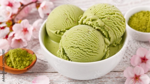 Creamy green tea ice cream in a bowl with flowers.